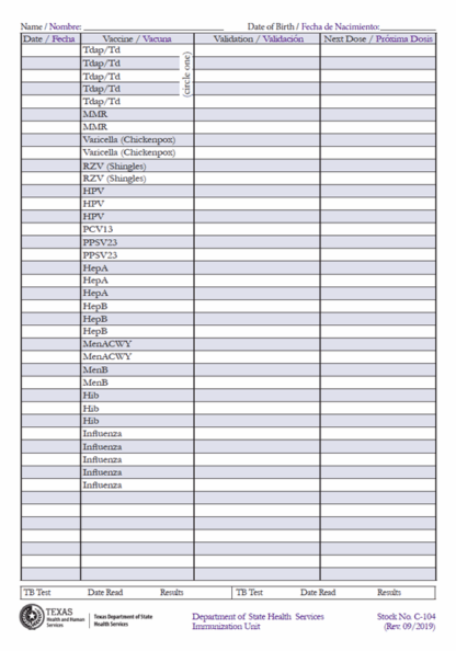 Adult Immunization Record Card (Bilingual). Rev: 09/2019