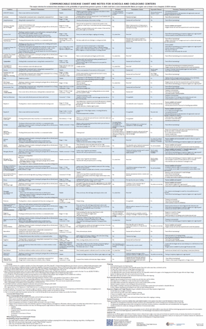 Communicable Disease Chart and Notes for Schools and Child-Care Centers Poster (English). Rev: 03/2024