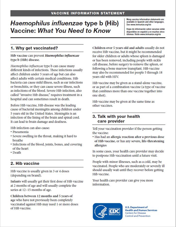 “Haemophilus influenzae type b (Hib) Vaccine What You Need to Know” Vaccine Information Statement (VIS) (English). Rev: 08/2021 quantity