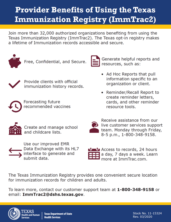 “Provider Benefits of Using the Texas Immunization Registry (ImmTrac2)” – Texas Immunization Registry (ImmTrac2) Flyer (English).