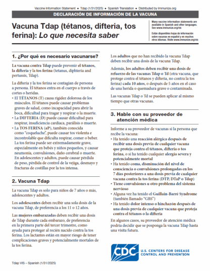 TDAP (Tetanus, Diphtheria, and Pertussis) Vaccine – What You Need to Know Vaccine Information Statement (VIS) – Spanish _0420 Rev: 04/2020