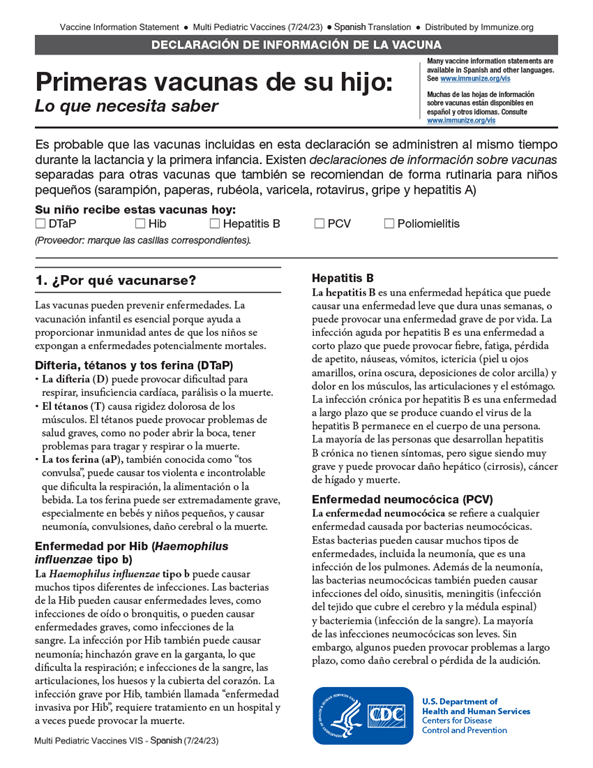 “Your Child’s First Vaccines What You Need to Know” Multi-Vaccine, Vaccine Information Statement (VIS) (English). Rev: 7/2023